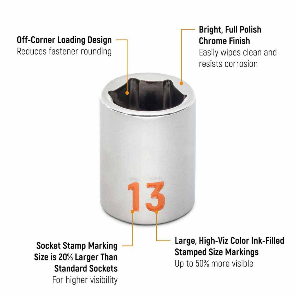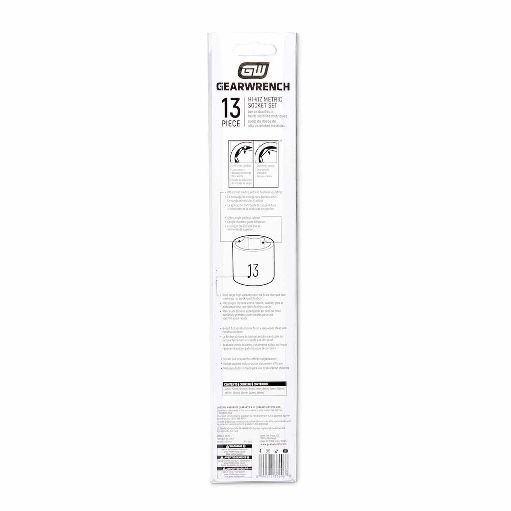 Hi-Viz metric socket set with large color ink-filled size markings for up to 50% more visibility and 20% larger stamp size. Features off-corner loading to reduce fastener rounding, chamfered openings for easy alignment, and a bright full-polish chrome finish that wipes clean and resists corrosion. Includes socket rail.