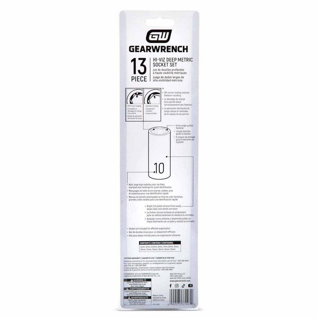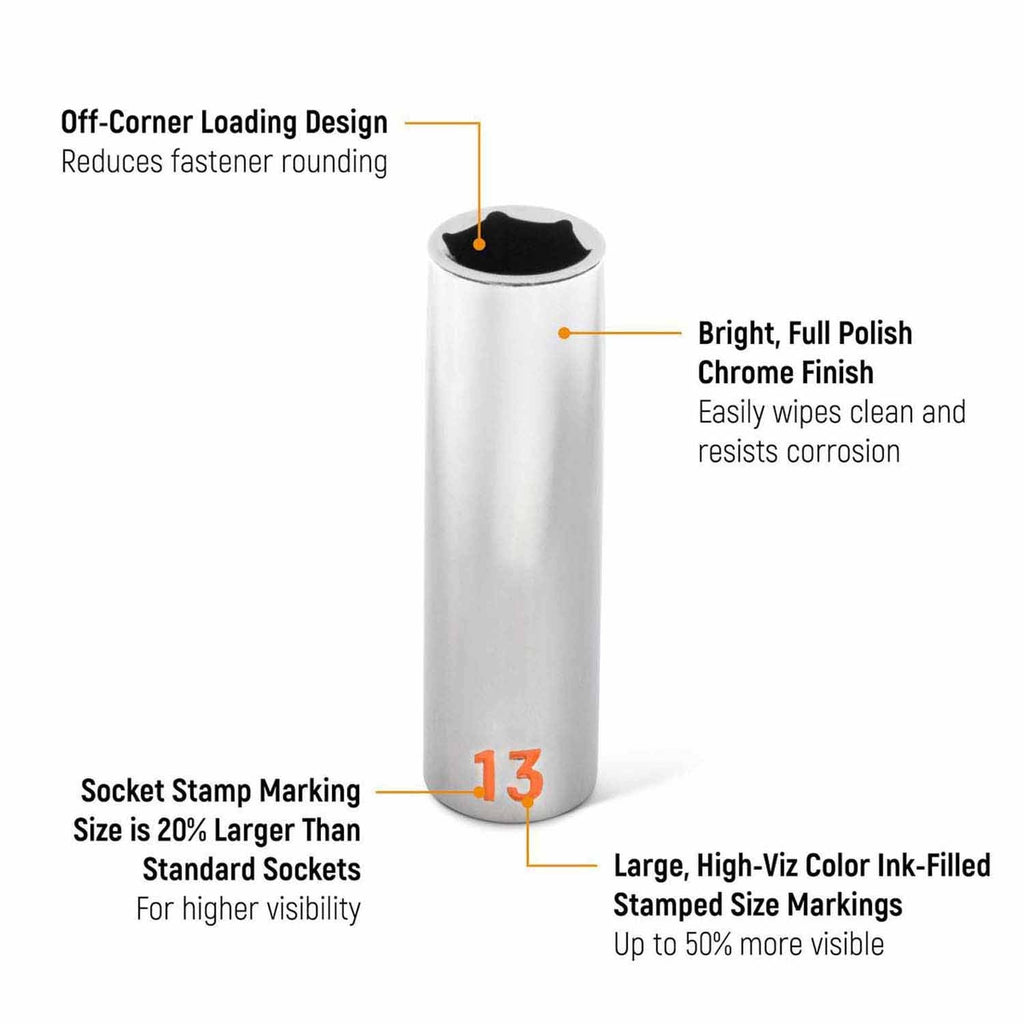 Hi-Viz deep metric socket set with large color-filled size markings (up to 50% more visible and 20% larger), off-corner loading to reduce fastener rounding, chamfered openings for quick alignment, and bright full-polish chrome finish that resists corrosion; includes socket rail.