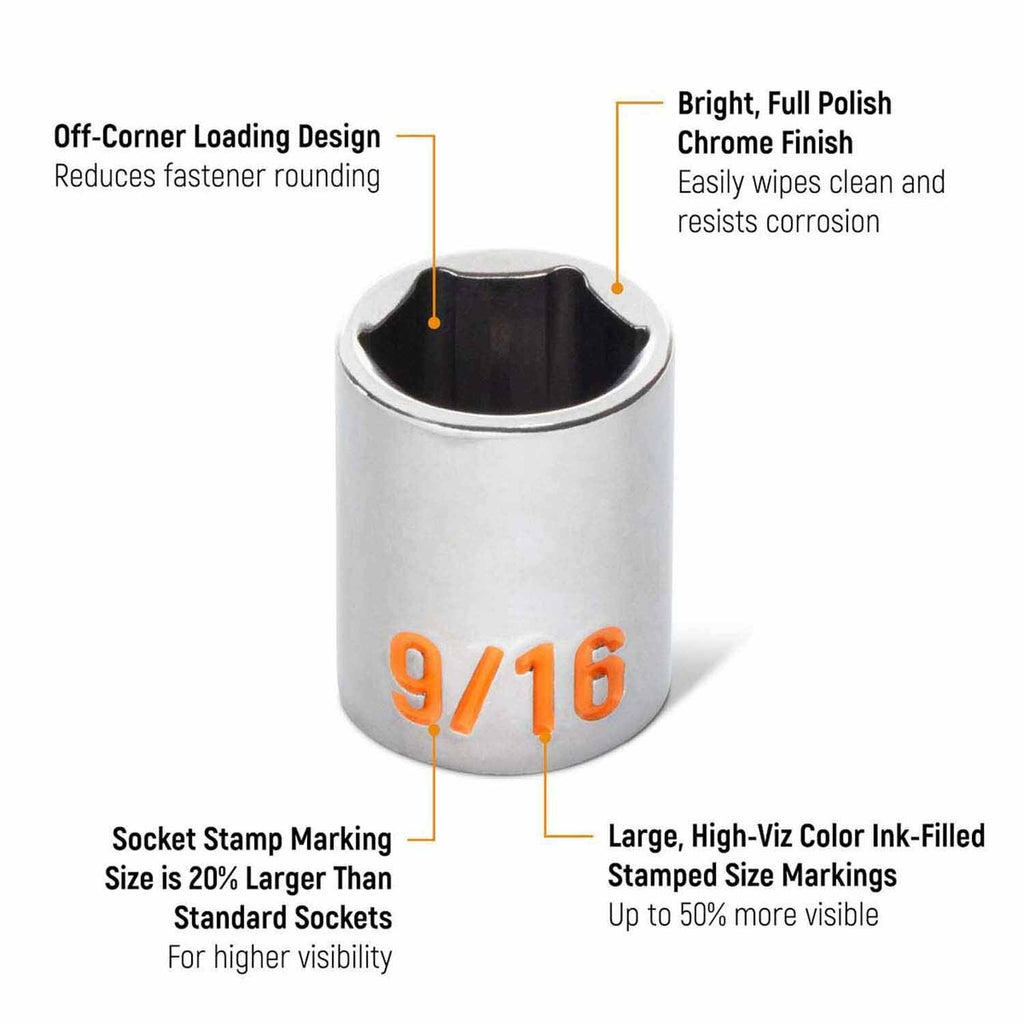 Hi-Viz socket set with large color-filled stamped size markings up to 50% more visible and 20% larger than standard for easy identification; off-corner loading reduces fastener rounding; chamfered openings guide fasteners; bright full-polish chrome resists corrosion and wipes clean; includes socket rail.