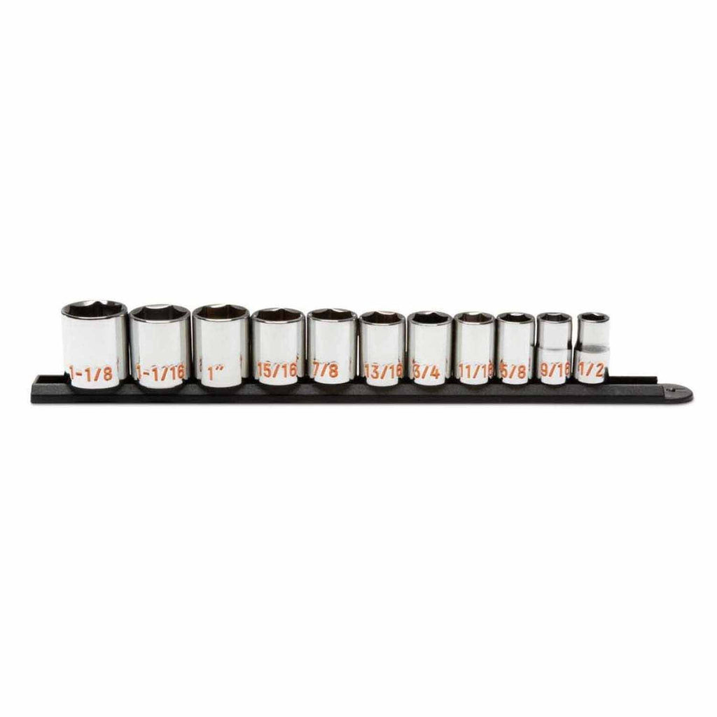 - (11) 1/2 in. Drive 6 Point SAE Sockets: 1/2 in, 9/16 in, 5/8 in, 11/16 in, 3/4 in, 13/16 in, 7/8 in, 15/16 in, 1 in, 1-1/16 in, 1-1/8 in