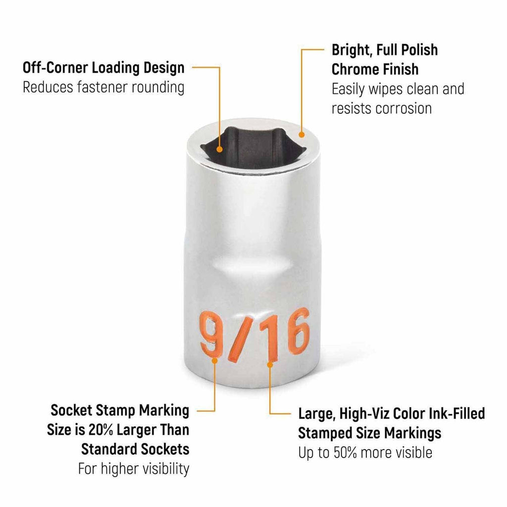 Hi-Viz 1/2 in. drive SAE socket set with large, color-filled stamped size markings for up to 50% better visibility. Features off-corner loading to reduce fastener rounding, chamfered openings for quick alignment, and a bright full-polish chrome finish that wipes clean and resists corrosion.