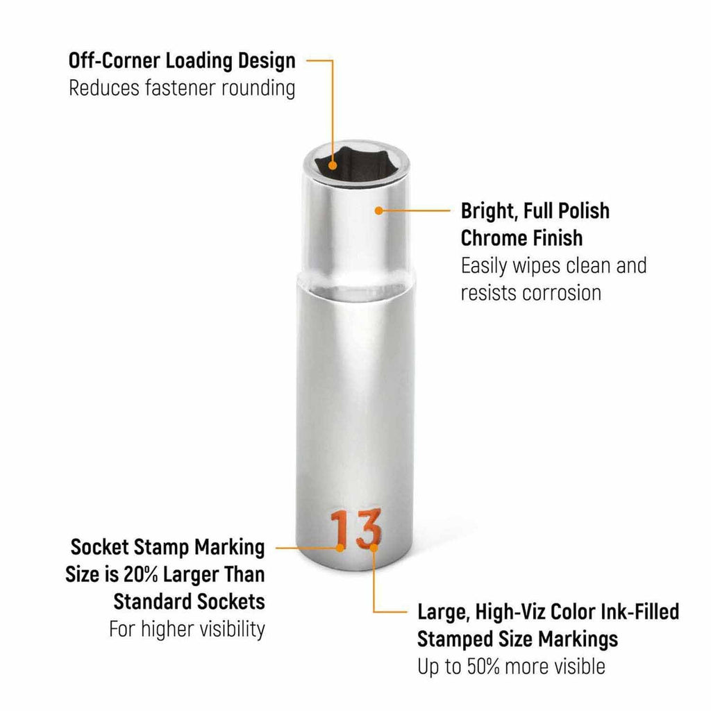 Hi-Viz deep metric socket set with large, color-filled size markings for up to 50% better visibility and 20% larger stamping, featuring off-corner loading to reduce fastener rounding, chamfered openings for quick alignment, and a bright full-polish chrome finish that resists corrosion and wipes clean.
