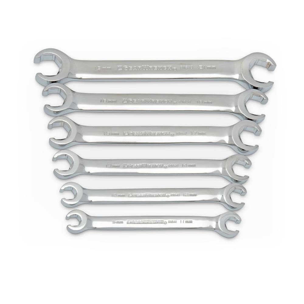 The GEARWRENCH flare nut wrenches provide grip on flare nuts used on brake lines, fuel pumps, and plumbing applications. The narrow opening on the heads allow the wrench to fit over tubes. The wrenches are made from alloy steel and have a bright chrome finish that is easy to clean. The size is stamped on both sides of the wrench for quick identification. The 81906 is a 6 pc. metric set that includes 9 mm x 11 mm, 10 mm x 12 mm, 13 mm x 14 mm, 15 mm x 17 mm, 16 mm x 18 mm, and 19 x 21 mm sizes.