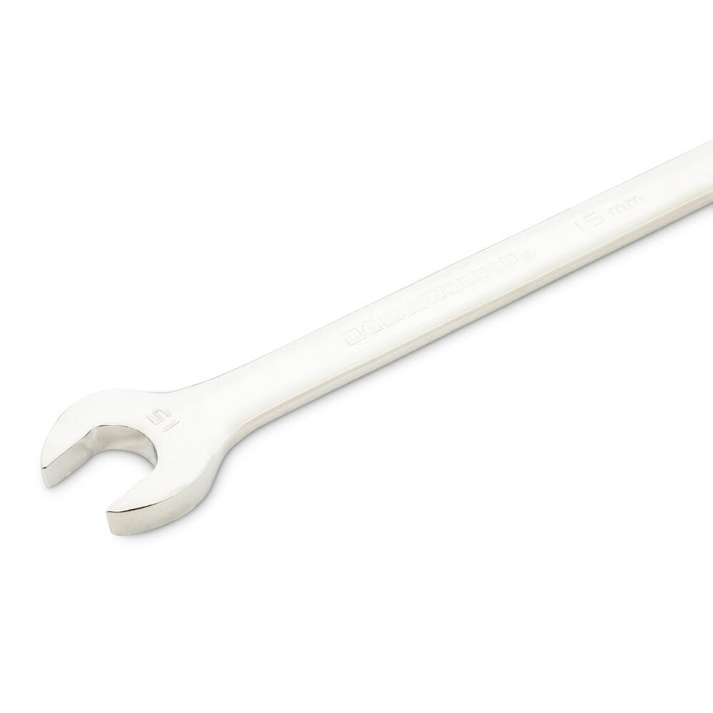 The GEARWRENCH combination wrenches are a durable, made from alloy steel with a bright, full polish finish. The off-corner loading design on both ends provides a stronger grip on fasteners, reduces fastener rounding, and delivers up to 25% more torque to the fasteners. Sizes are stamped on the open end head, as well as the beam for quick and easy identification. The box end is offset 15° for increased access to fasteners. The 81924 is a 14 piece 12 point, metric standard length set including sizes 6 mm to 19 mm.