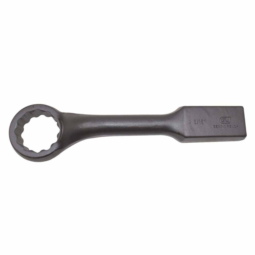 Heavy-duty 45-degree offset slugging wrench with 2-3/16 in 12-point box end and black oxide finish for striking applications and clearance in confined areas.