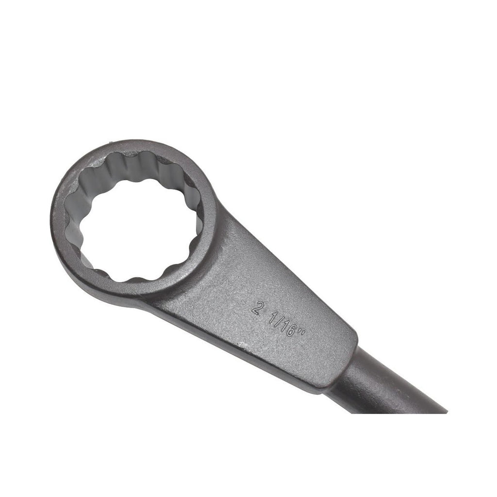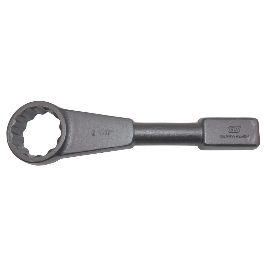 Built for demanding oil and gas and MRO environments, the GearWrench 2-1/16 in. 12 Point Standard Slugging Wrench is engineered to tackle the toughest fastener challenges. Drop forged from heat-treated steel and finished with a corrosion-resistant black oxide coating, this wrench is built to withstand repeated heavy strikes. The box end stays securely engaged with the fastener during impact, while the large striking surface delivers efficient force transfer with every hammer blow. Hard-stamped size markings ensure fast, reliable identification on the job, and the straight rectangular handle design resists springing under heavy sledging. Meets or exceeds all ASME B107.59 standards.