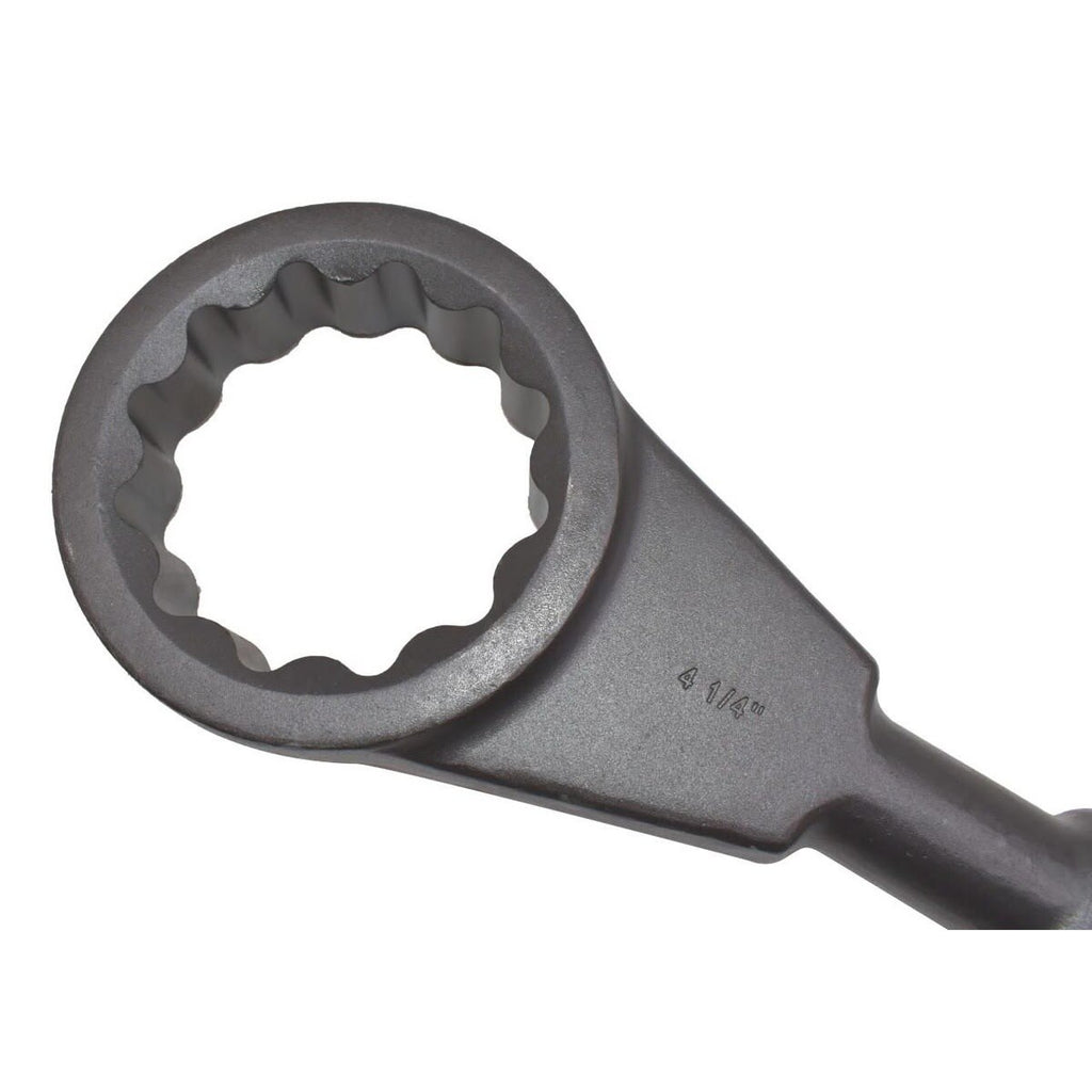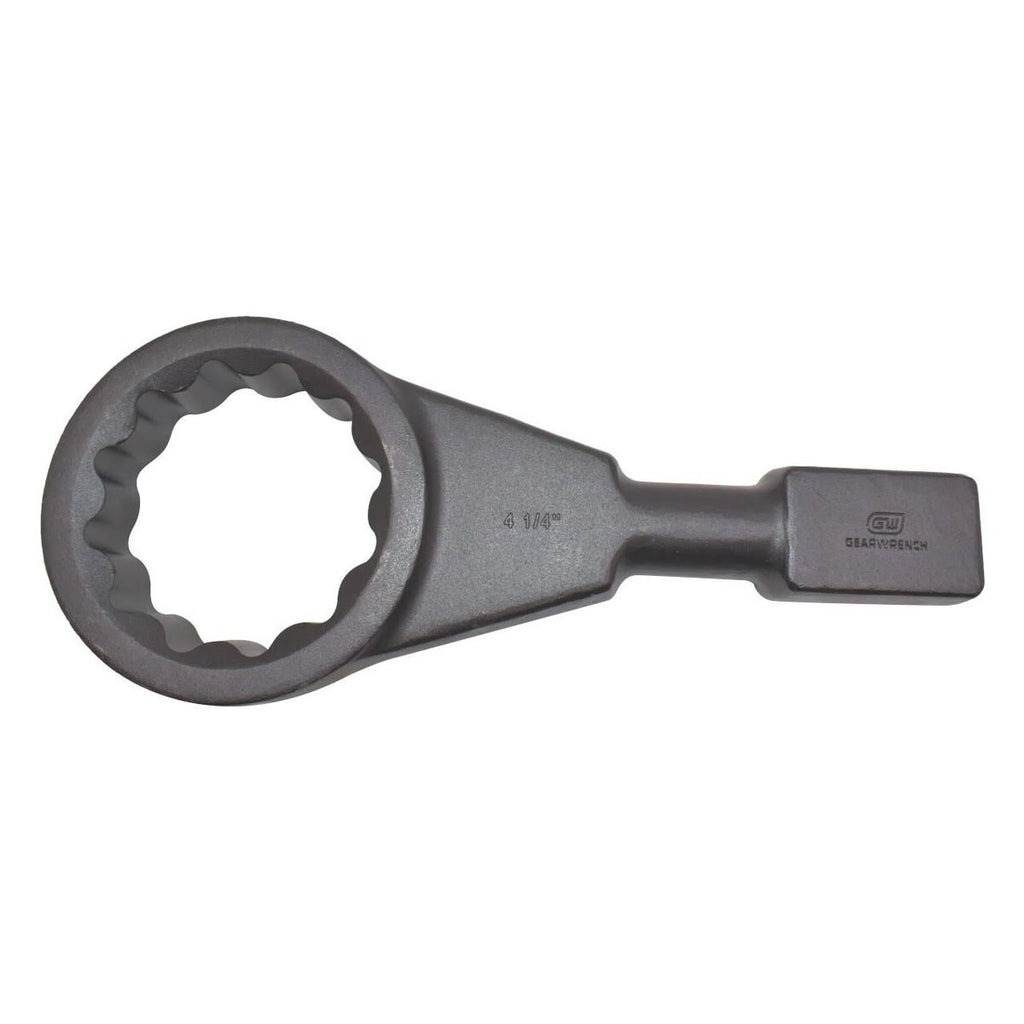 The GEARWRENCH 82398-05 is a 4-1/4 in. 12 Point Standard Slugging Wrench built for the demanding conditions of oil and gas and MRO environments. Forged from heat-treated steel and finished with a corrosion-resistant black oxide coating, this wrench is engineered to withstand repeated heavy strikes from a hammer or mallet. The 12-point box end stays securely engaged with fasteners during impact, while clearly hard-stamped size markings allow for quick identification on the job. Backed by a Full Lifetime Warranty, this slugging wrench meets or exceeds all ASME B107.59 standards.