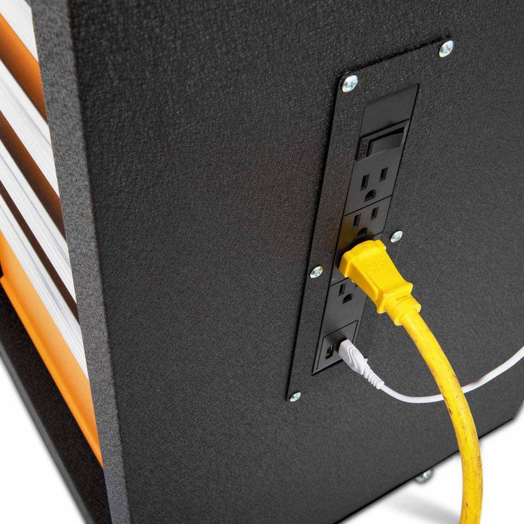 - Built-in charging station with 4 outlets, 2 USB ports, and on/off switch