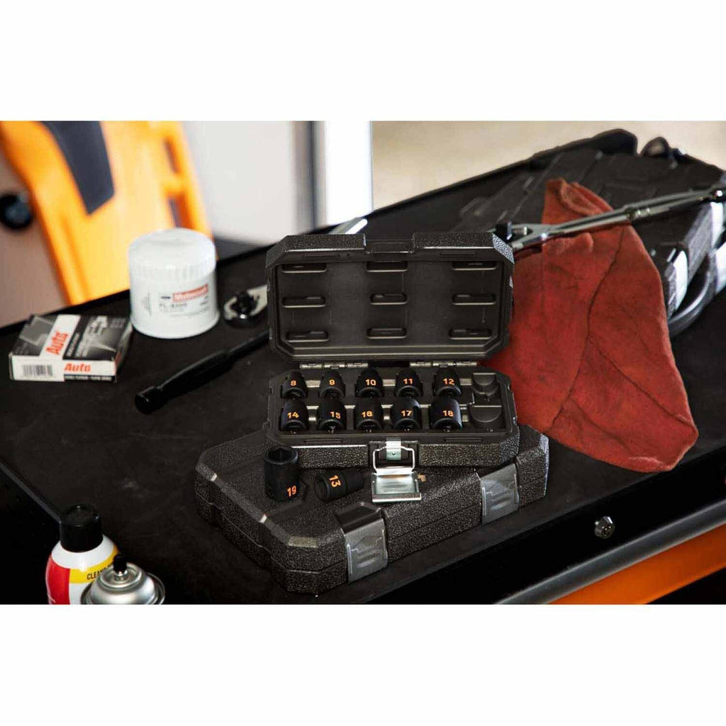 High-performance impact socket set made from durable chrome molybdenum alloy steel with large hi-viz ink-filled size markings for quick identification. Off-corner loading reduces fastener rounding, and the industrial black finish resists corrosion. Meets or exceeds ASME specifications.