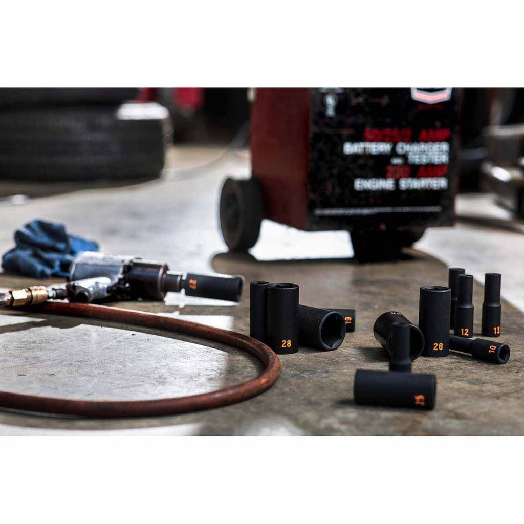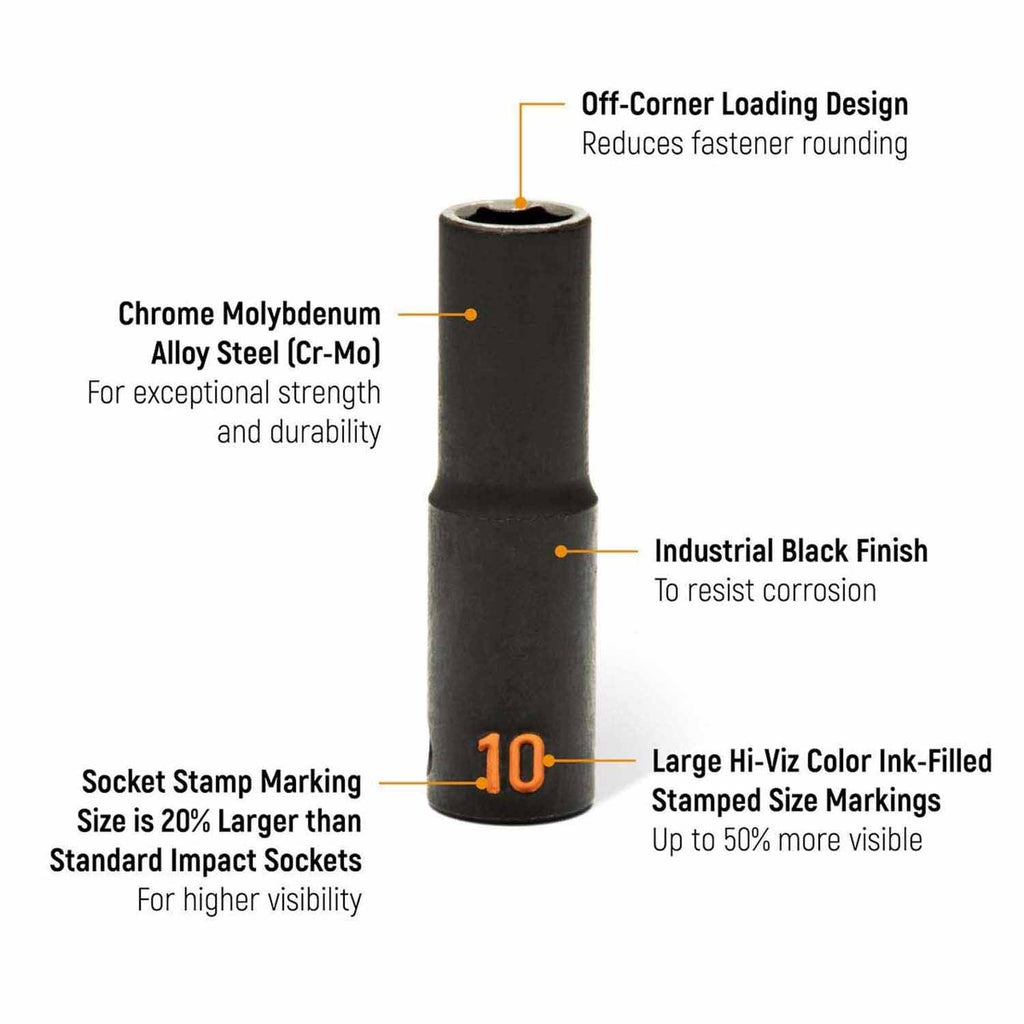 High-visibility deep impact socket set made from durable chrome molybdenum alloy steel with ink-filled size markings for quick identification. Features off-corner loading to reduce fastener rounding, an industrial black finish for corrosion resistance, and meets or exceeds ASME specifications. Includes a blow mold case.