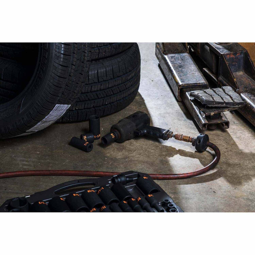 High-performance 39-piece SAE impact socket set built from durable Cr-Mo steel with large hi-viz ink-filled size markings, off-corner loading to reduce fastener rounding, and an industrial black finish. Meets or exceeds ASME specifications and includes a blow mold case.