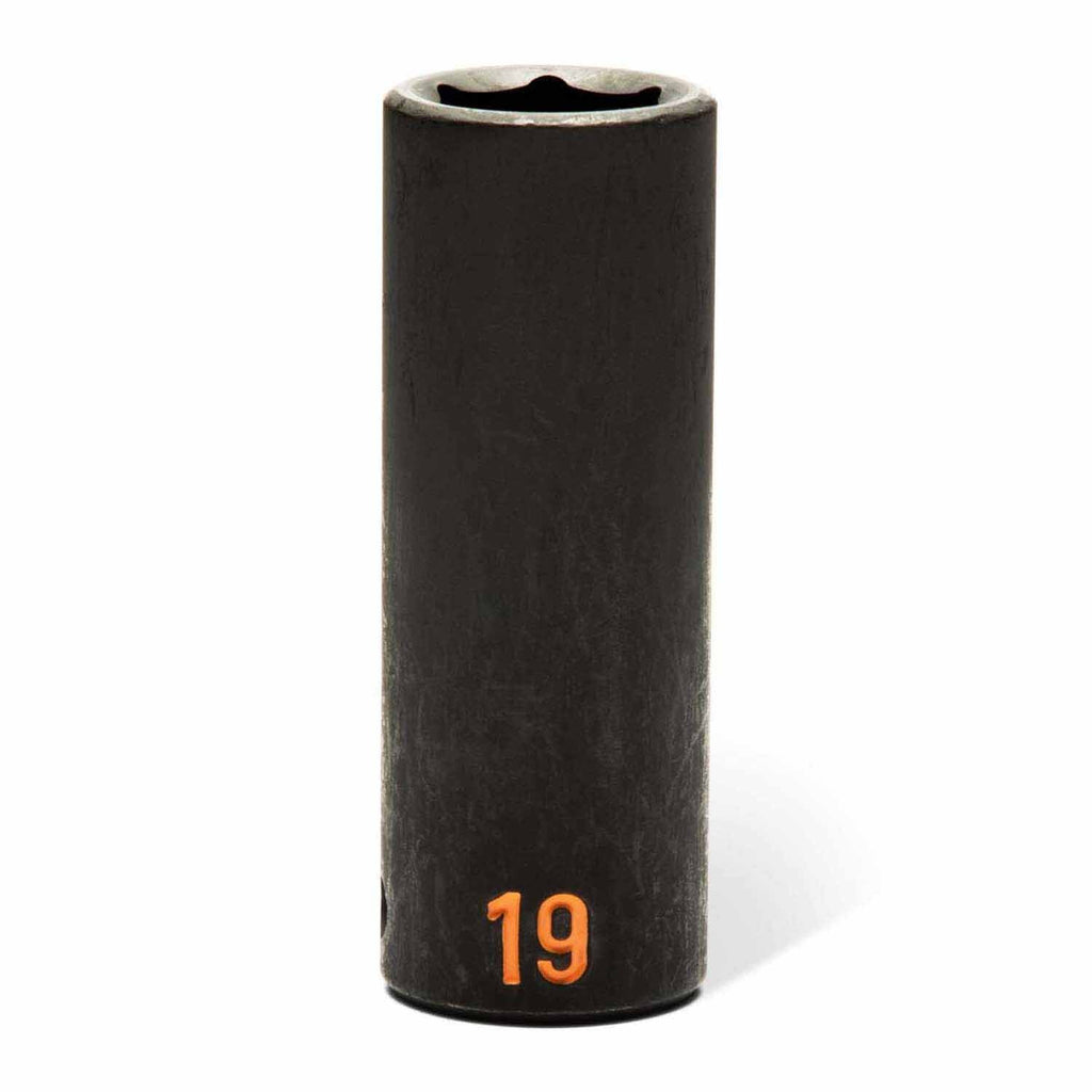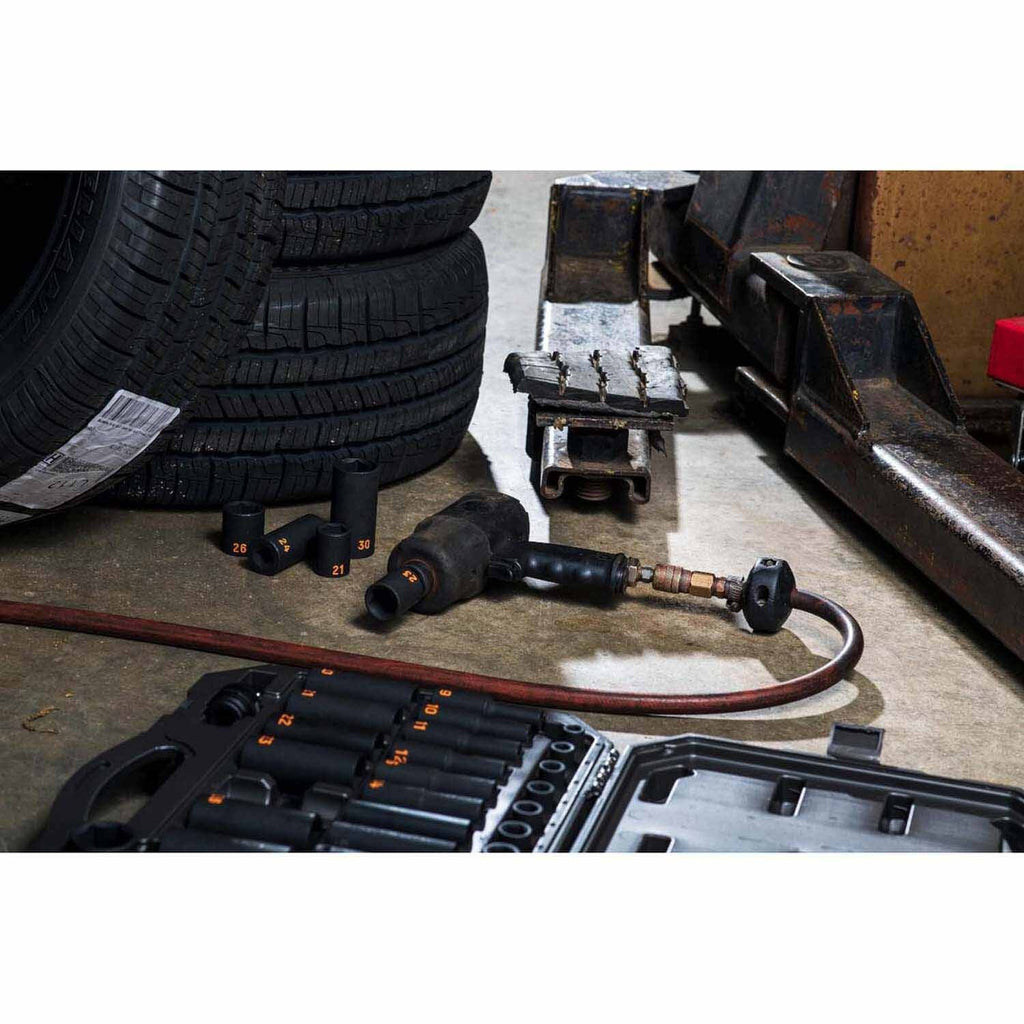 High-performance impact socket set made from chrome molybdenum alloy steel for strength and durability. Hi-Viz ink-filled size markings are up to 50% more visible with 20% larger stamp size for quick identification. Off-corner loading reduces fastener rounding, and the industrial black finish resists corrosion. Meets or exceeds ASME specifications.