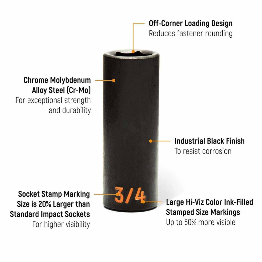 Durable deep impact socket set made from Cr-Mo steel with large Hi-Viz ink-filled size markings for quick identification, off-corner loading to reduce fastener rounding, corrosion-resistant industrial black finish, and meets or exceeds ASME specifications.