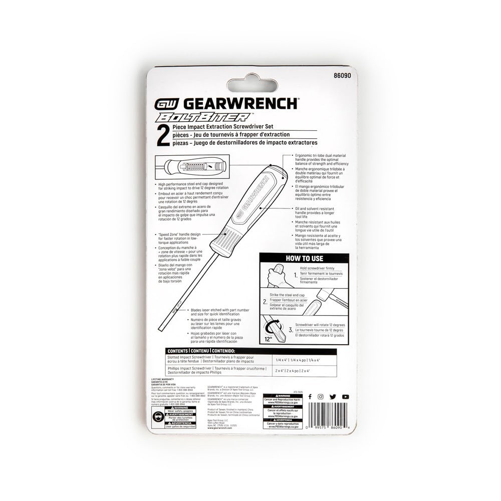 Bolt Biter™ impact screwdrivers offer the convenience of a standard screwdriver with the extraction abilities of a dedicated impact driver, loosing rusted, stripped, or other difficult-to-remove screws. Their high-performance steel handle end cap transfers impact shock to an internal mechanism that rotates the heat-treated alloy steel shaft 12 degrees when struck. High-strength tips are rust-resistant nickel chrome plated.