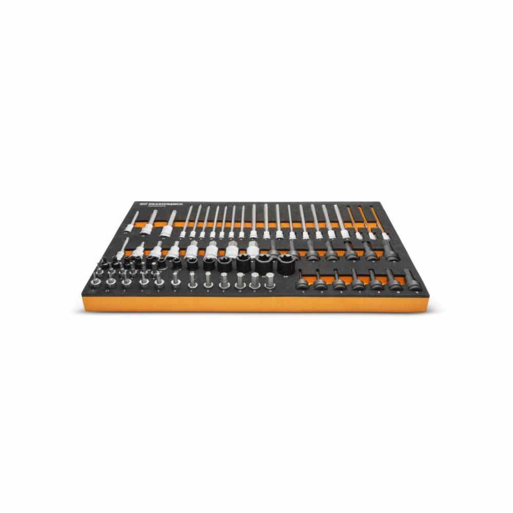 GEARWRENCH mechanics tools have been designed with professional users in mind for better productivity, access, and strength. GWMSBSKCBMM is one of the wide collection of Modular Sets we offer that feature premium quality tools organized in sturdy foam storage trays. These chemical and solvent resistant trays are designed to fit in a wide range of tool storage systems, including our GSX storage line of products. Foams are in contrasting orange and black with high visibility size markings for easy tool identification. Each of the fine tools nests in a custom cutout that provides optimal protection, organization, and accessibility.