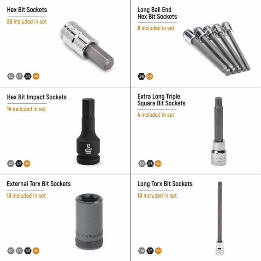 - Includes the most popular sizes of hex bit, Torx® bit, External Torx®, and triple square bit sockets