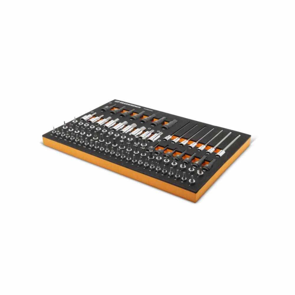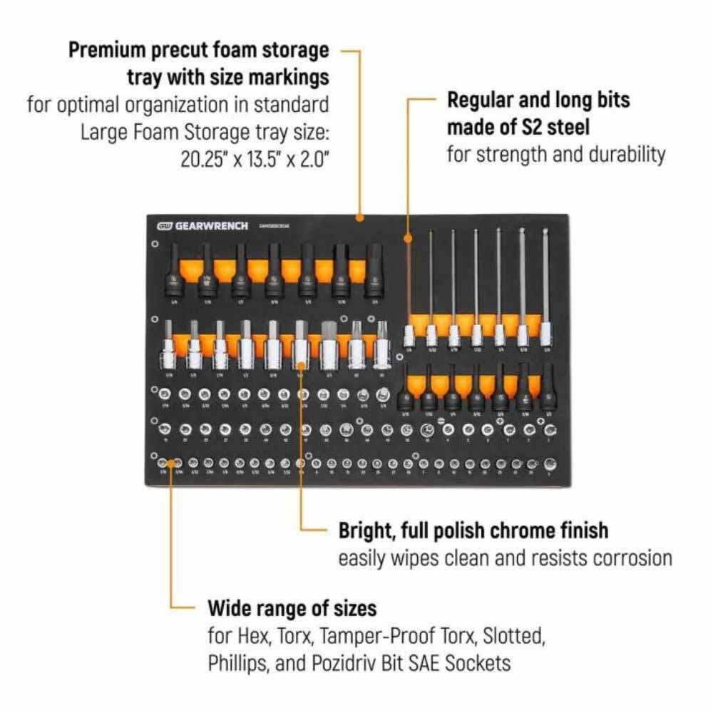 GEARWRENCH mechanics tools have been designed with professional users in mind for better productivity, access, and strength. The 88 piece 1/4”, 3/8”, 1/2” drive SAE bit socket set in a foam storage tray is one of the wide collection of GEARWRENCH Modular Sets. These chemical and solvent resistant foam trays are designed to fit in a wide range of tool storage systems, including our GSX storage line of products. The foams are in contrasting orange and black with high visibility size markings for easy tool identification. Each of the tools fits in a custom cutout that provides optimal protection, organization, and accessibility.