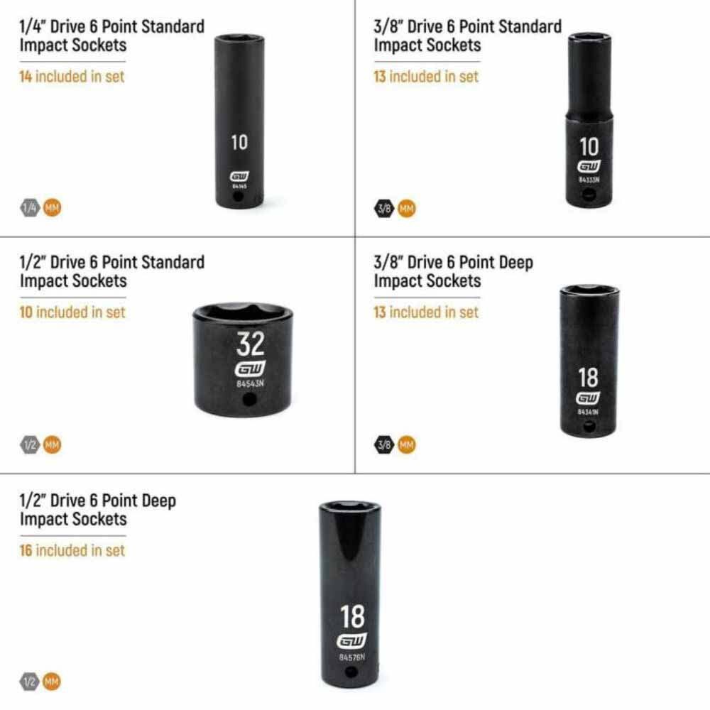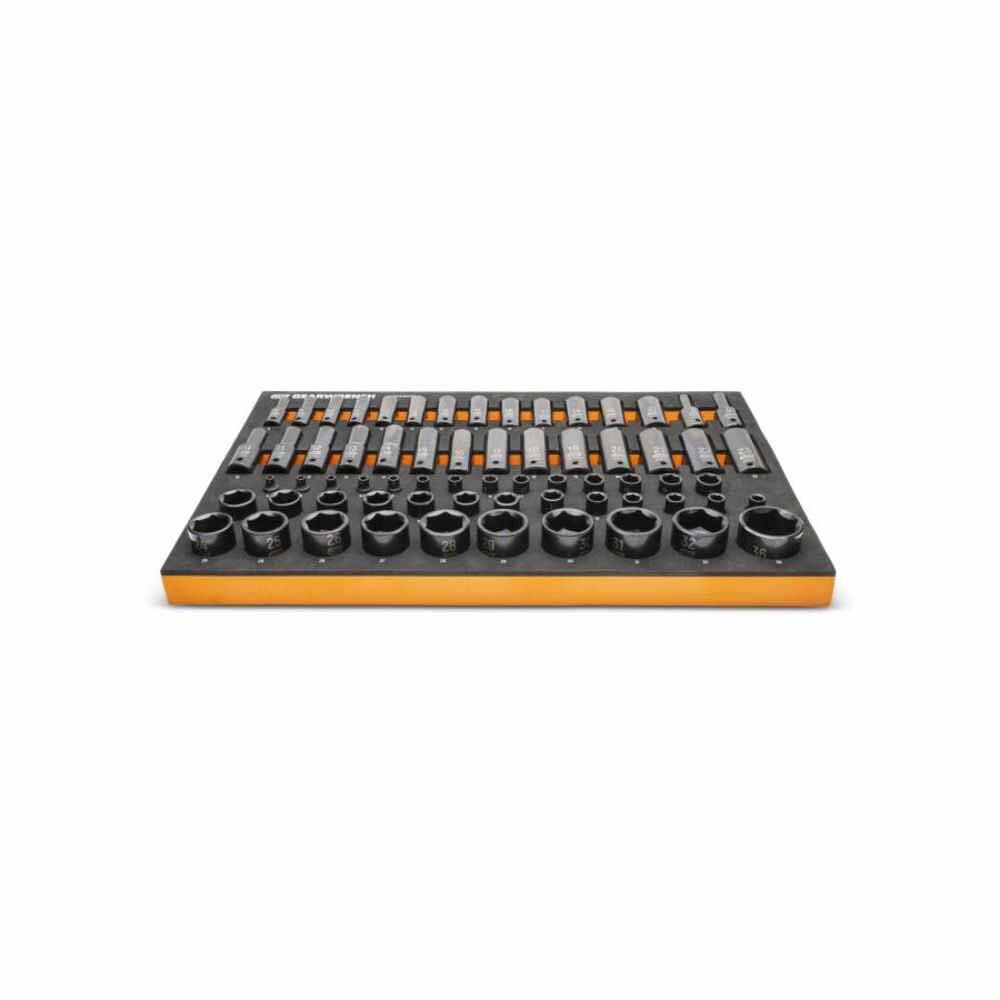 GEARWRENCH mechanics tools have been designed with professional users in mind for better productivity, access, and strength. The 66 piece 1/4”, 3/8”, 1/2” drive 6 point metric impact socket set in a foam storage tray is one of the wide collection of GEARWRENCH Modular Sets. These chemical and solvent resistant foam trays are designed to fit in a wide range of tool storage systems, including our GSX storage line of products. The foams are in contrasting orange and black with high visibility size markings for easy tool identification. Each of the tools fits in a custom cutout that provides optimal protection, organization, and accessibility.