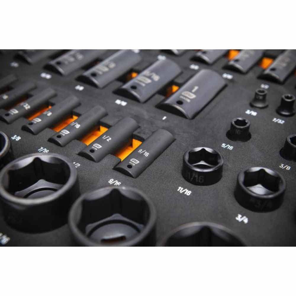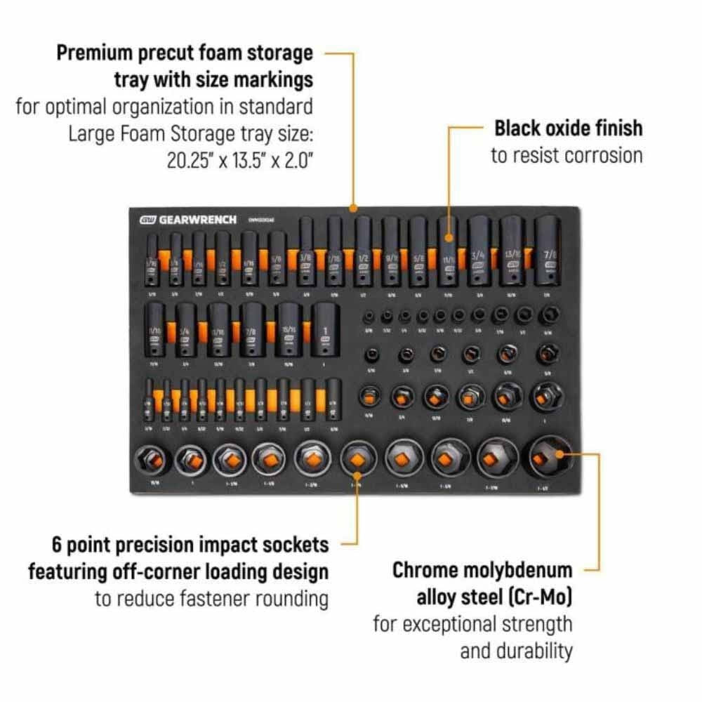 GEARWRENCH mechanics tools have been designed with professional users in mind for better productivity, access, and strength. The 63 piece 1/4”, 3/8”, 1/2” drive 6 point SAE impact socket set in a foam storage tray is one of the wide collection of GEARWRENCH Modular Sets. These chemical and solvent resistant foam trays are designed to fit in a wide range of tool storage systems, including our GSX storage line of products. The foams are in contrasting orange and black with high visibility size markings for easy tool identification. Each of the tools fits in a custom cutout that provides optimal protection, organization, and accessibility.