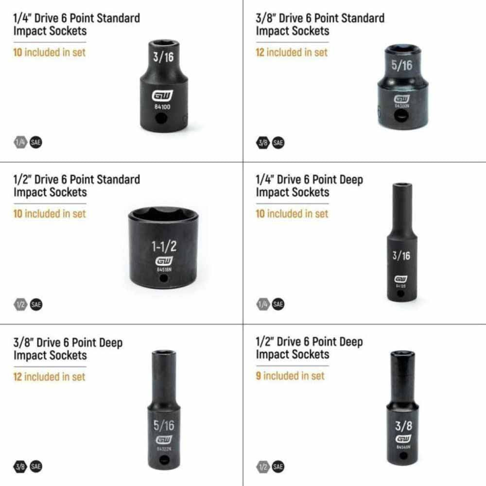 - (10) 1/2" Drive 6 Point Standard Impact Sockets: 5/16" - 1-1/2"