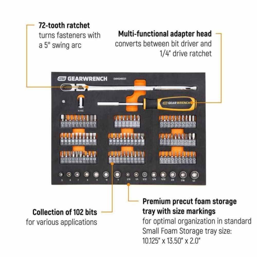 - (102) Bits: Hex, Slotted, Phillips, Pozidriv, Torx, Tamper-Proof Torx, Square, and Hex Nut Driver
