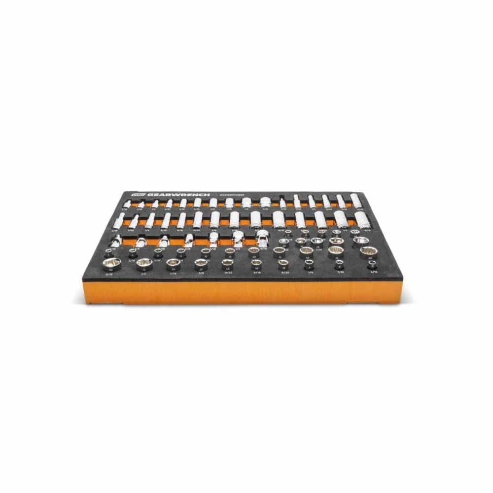 GEARWRENCH mechanics tools have been designed with professional users in mind for better productivity, access, and strength. The 68 piece 1/4” drive master metric socket set in a foam storage tray is one of the wide collection of GEARWRENCH Modular Sets. These chemical and solvent resistant foam trays are designed to fit in a wide range of tool storage systems, including our GSX storage line of products. The foams are in contrasting orange and black with high visibility size markings for easy tool identification. Each of the tools fits in a custom cutout that provides optimal protection, organization, and accessibility.